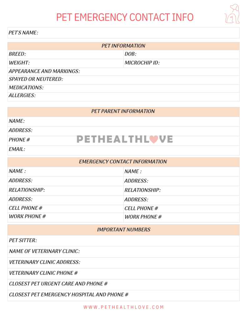 I made a Pet Emergency Contact Sheet that is FREE in my Resource Library. Just fill in your pet’s information and the contact info for the trusted person that will take care of your pets in your absence. Subscribe today to get complete access to this sheet and other pet printables!
